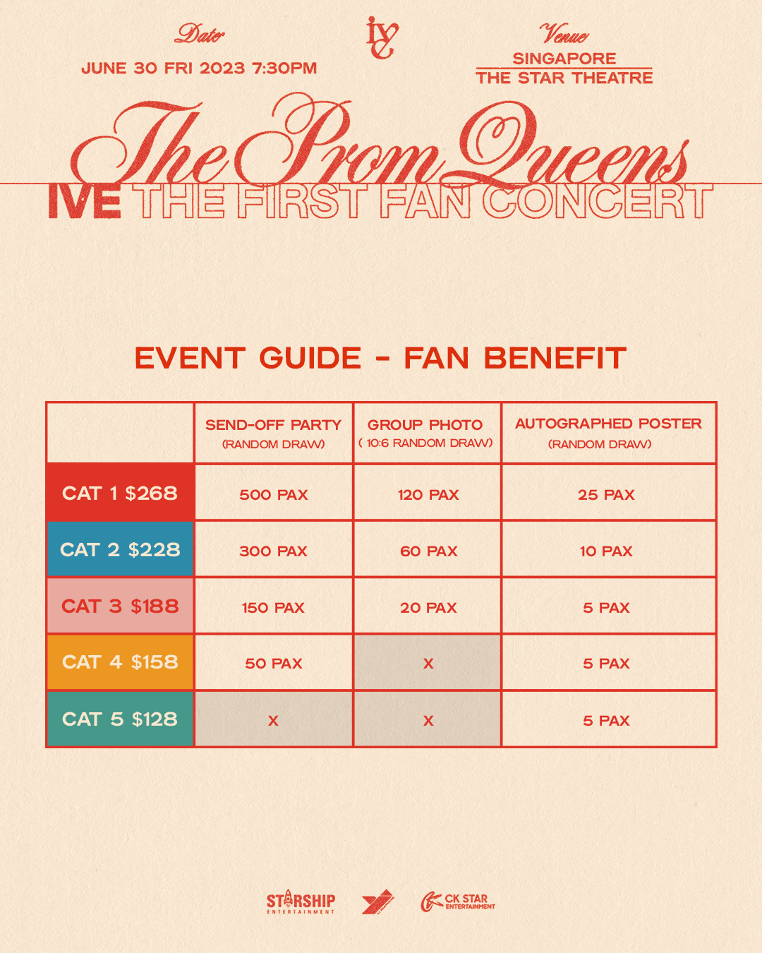 | Ticket Category / Number of random chances | Send off party | 10-fans group photo | Autographed poster |